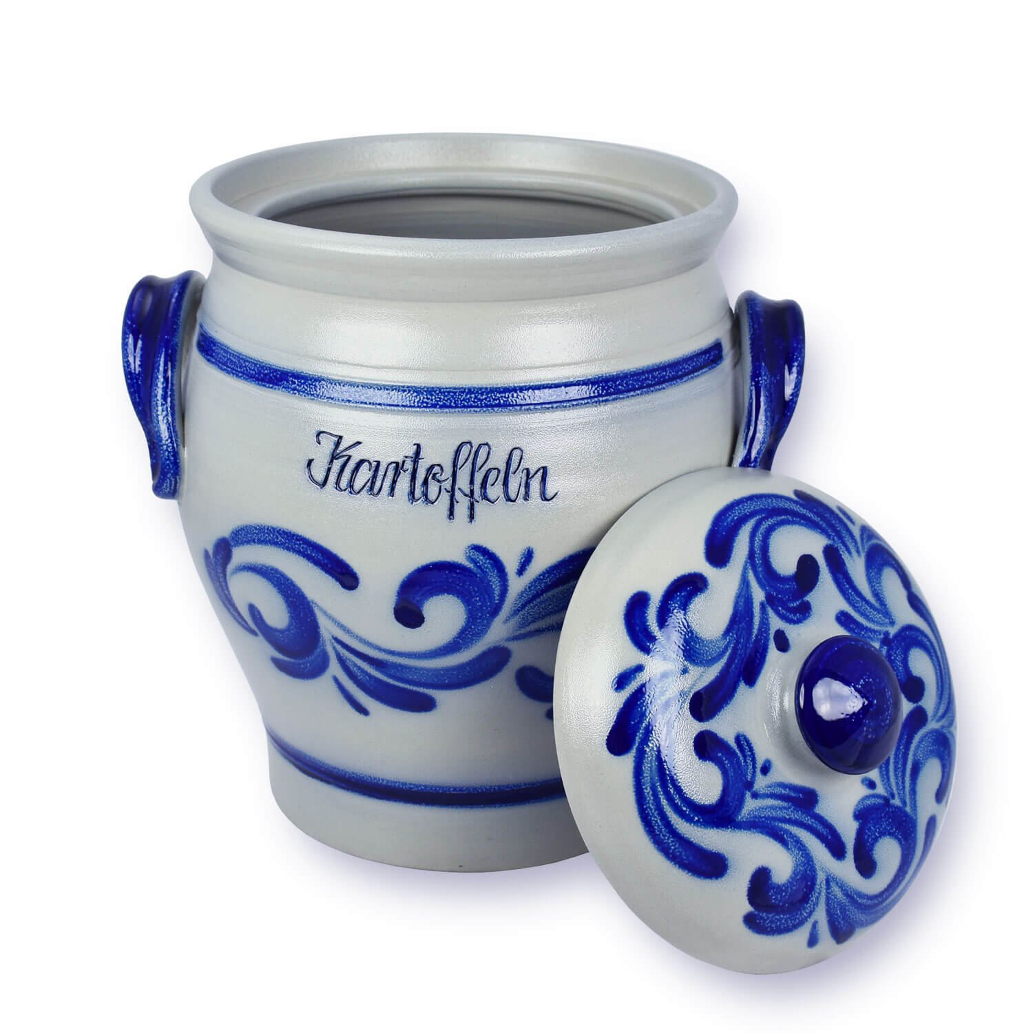 Verwöhnen Sie Ihre Kartoffeln und Ihre Küche mit unserem handgefertigten blauen Kartoffeltopf aus salzglasiertem Westerwald-Keramik mit Keramikdeckel - der perfekte Begleiter für frische und schmackhafte Kartoffeln.