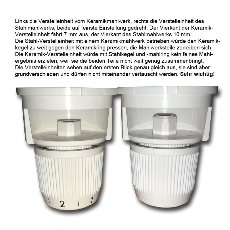 Die Verstelleinheit kann, genauso wie die Transportschnecke, kaputt gehen, wenn Sie versuchen, Mais oder harte Hülsenfrüchte zu mahlen.